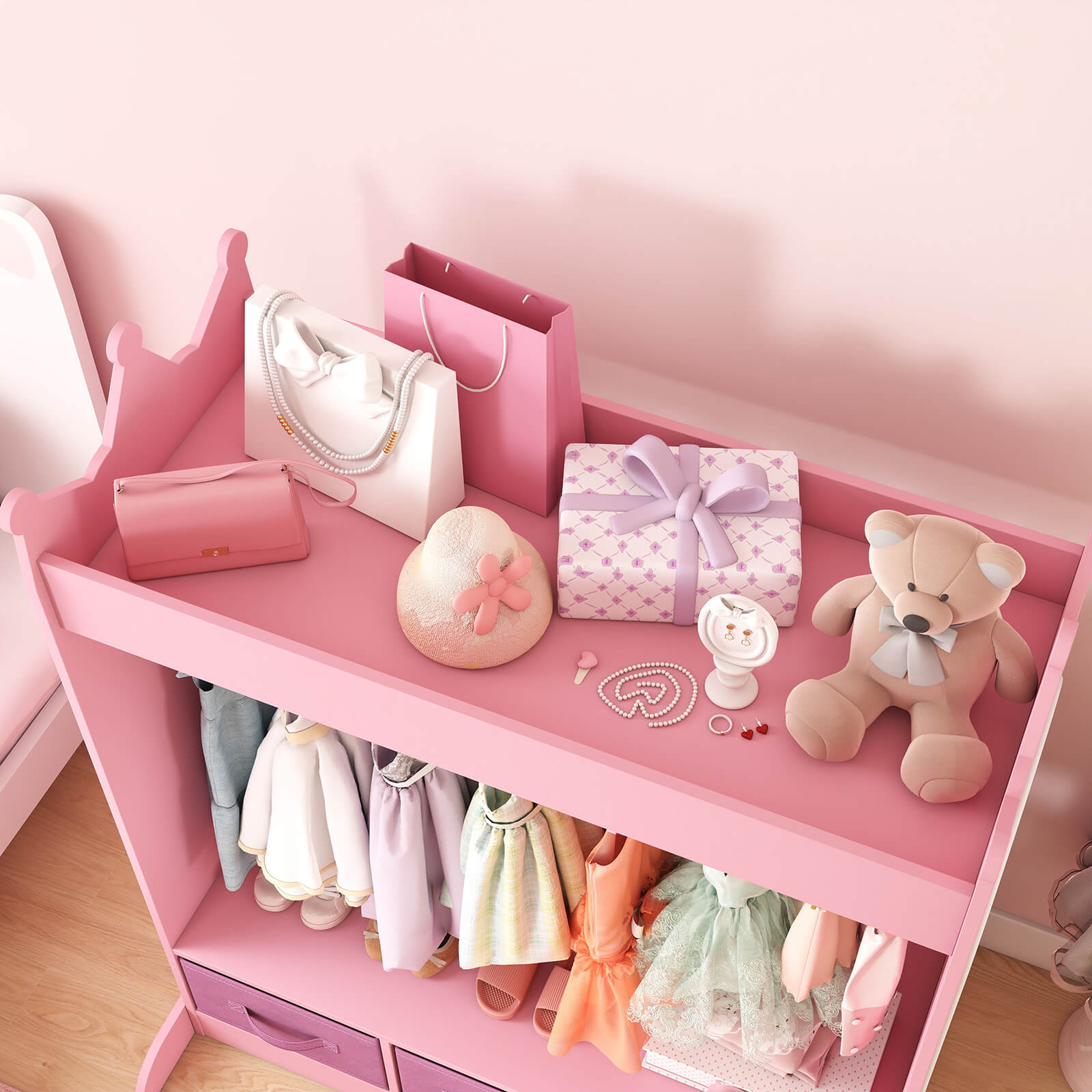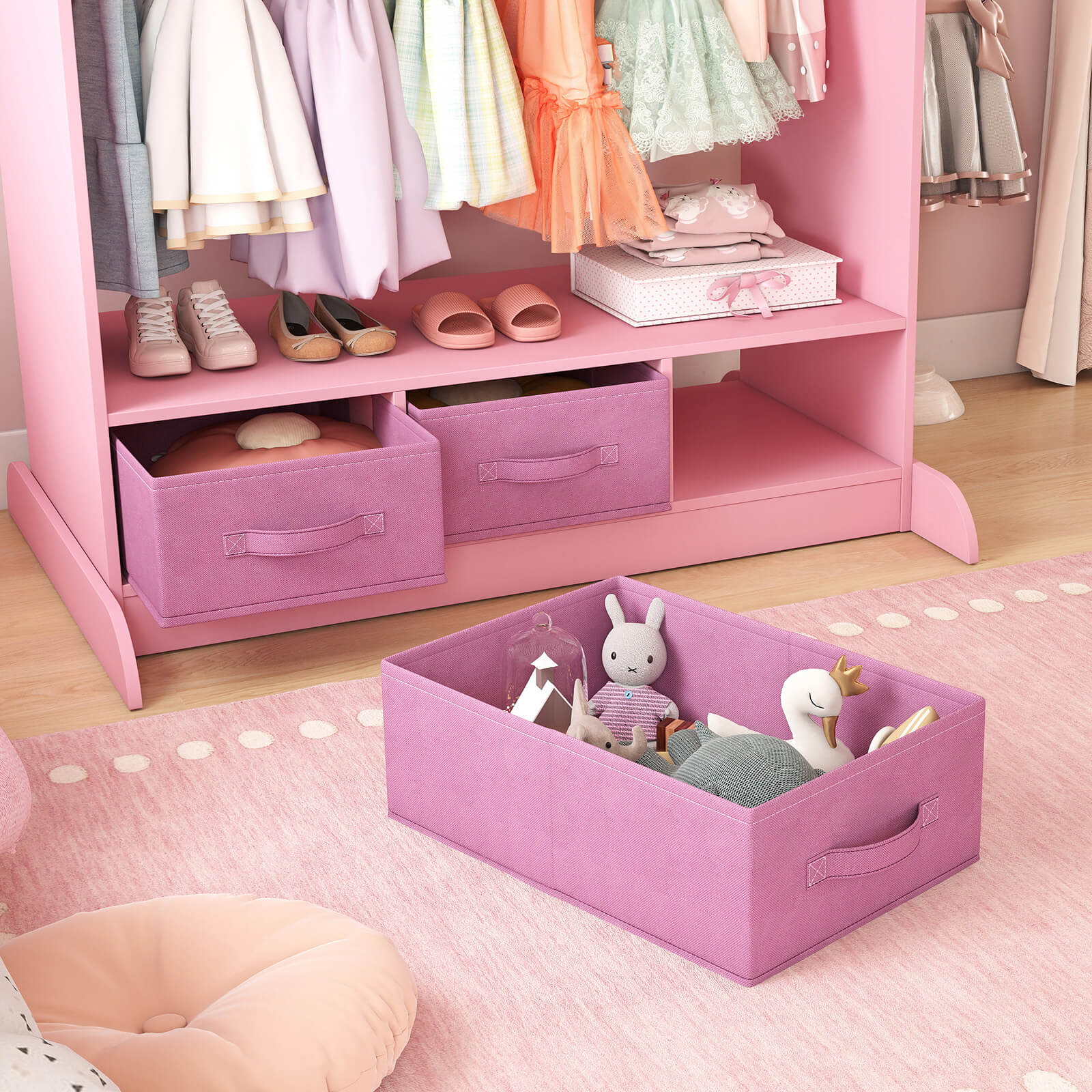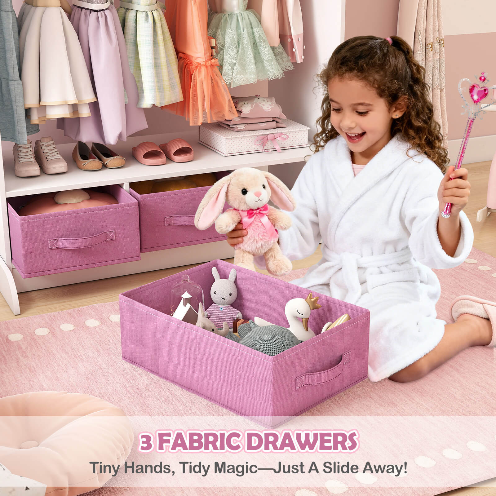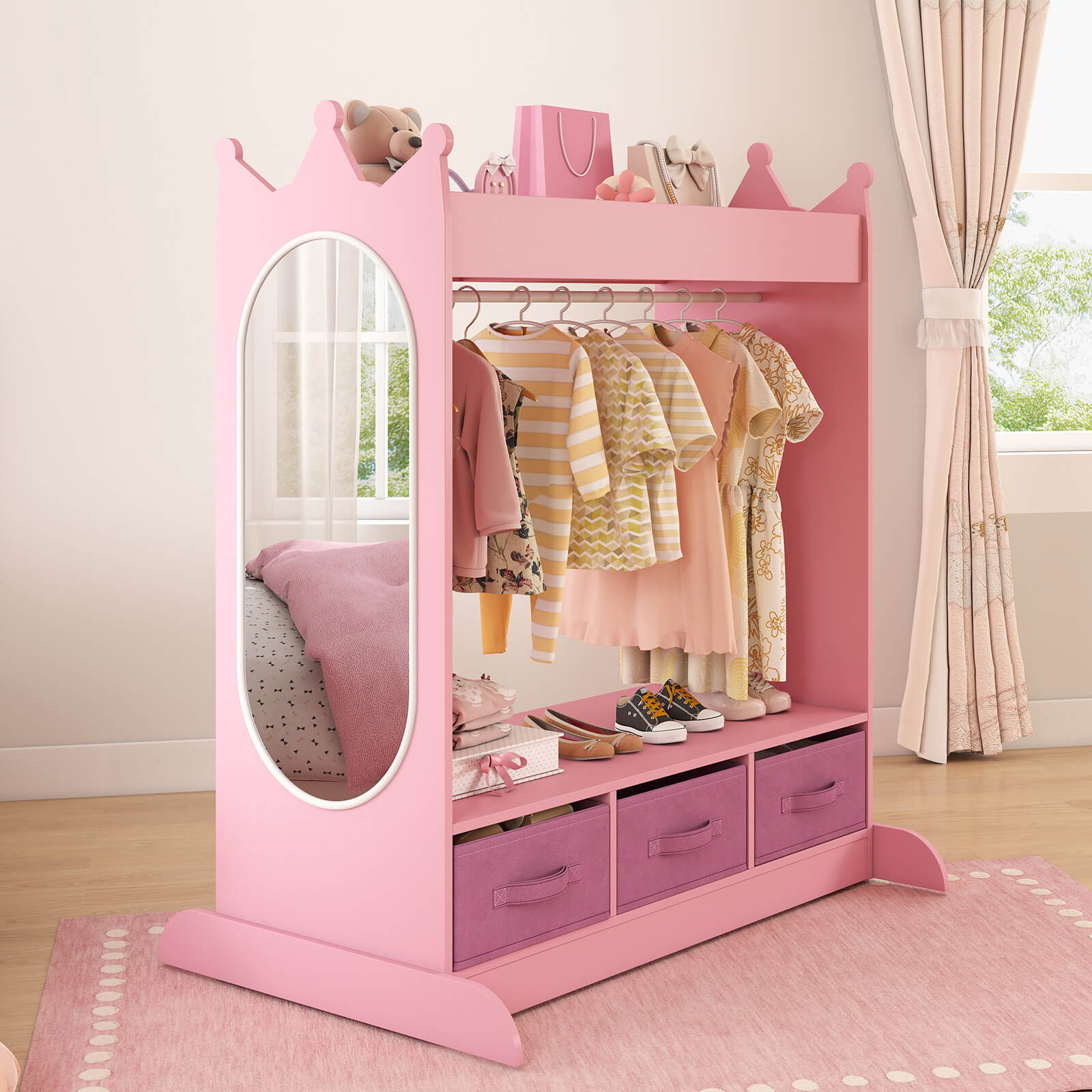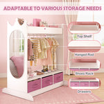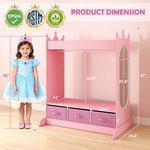 - MULTIPLE STORAGE OPTIONS - This kids wardrobe features a sturdy rod, a spacious top shelf with side edges, 3 non-woven drawers. So this armoire closet not only meets different storage needs but also features a child-size mirror to help your little princess appreciate her outfits and cultivate her aesthetic ability.