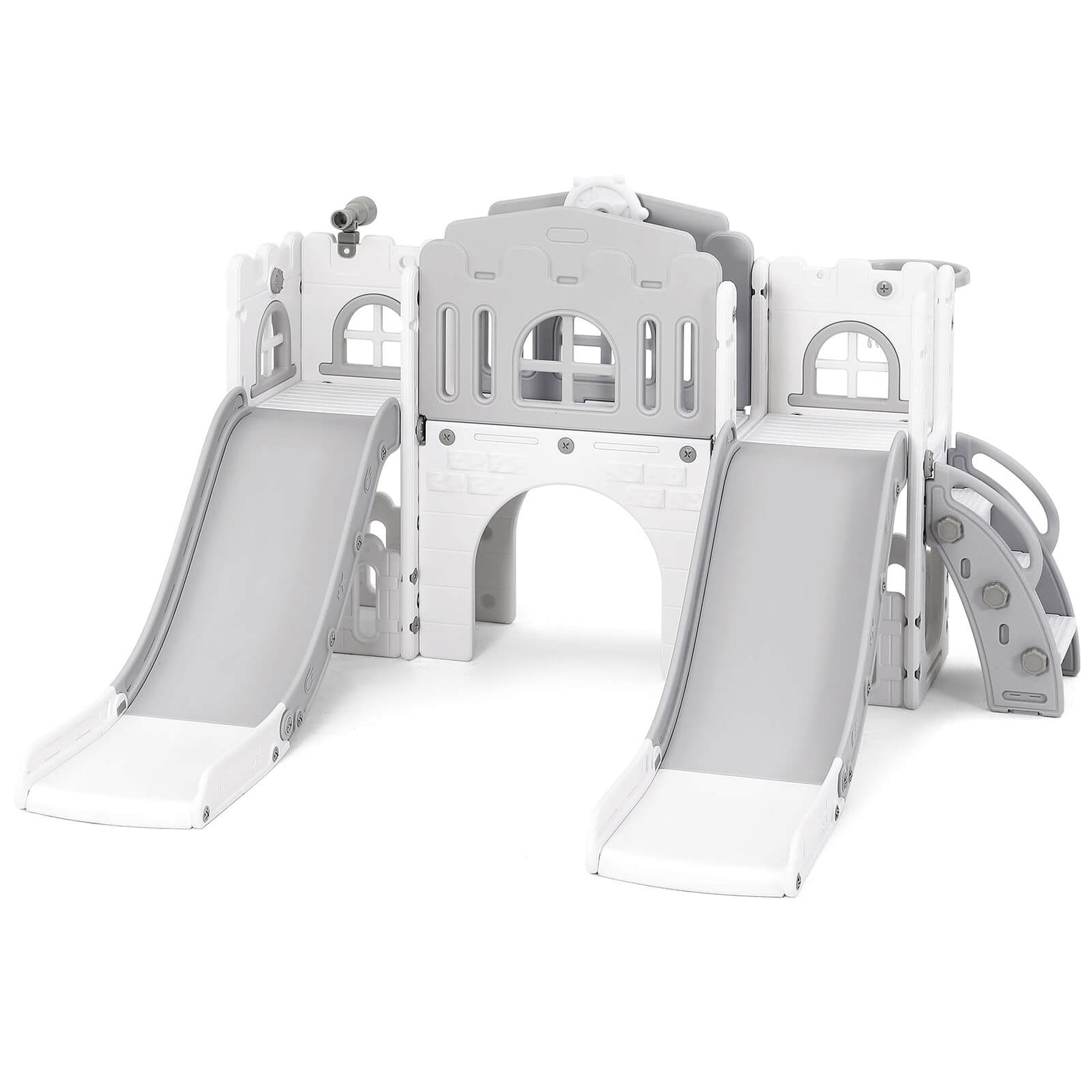 - 【10-in-1 Multifunctional Playset】JOYLDIAS 10 in 1 toddler slide set has 10 activity areas, including double 2 slides, basketball hoop, storage space and non-slip enclosed step, widened climbing ladder, crawl-through tunnel and telescope. It can exercise children's muscle strength, balance and coordination and make the reaction more agile. And add baby's fun during the play.