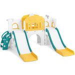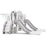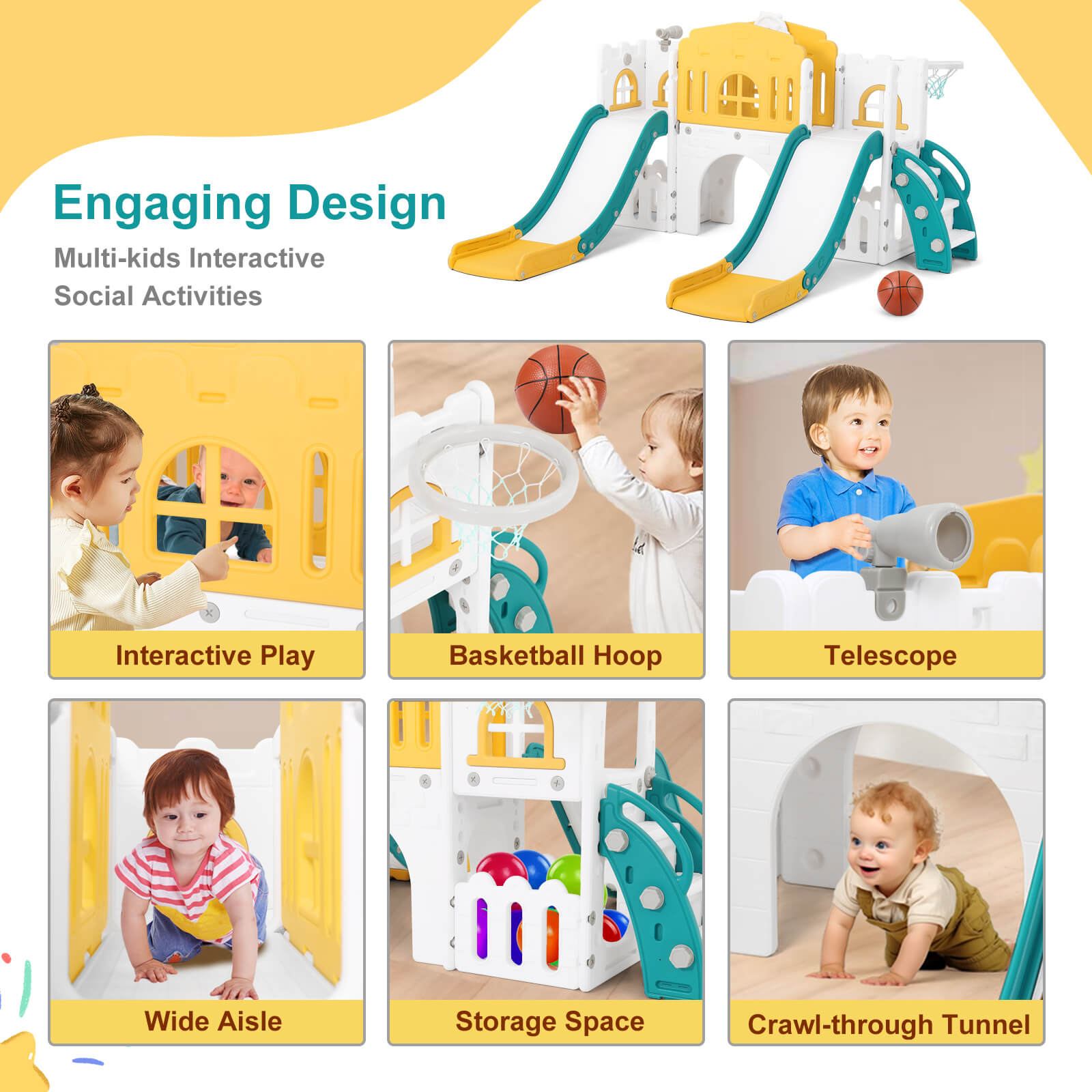 - 【9-in-1 Multifunctional Playset】JOYLDIAS 9 in 1 toddler slide set has 9 activity areas, including double 2 slides, basketball hoop, storage space and non-slip enclosed step, widened climbing ladder, crawl-through tunnel and telescope. It can exercise children's muscle strength, balance and coordination and make the reaction more agile. And add baby's fun during the play.