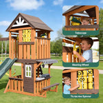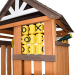 - This play tower features a wooden sunshade to shield kids from the sun. It comes with a steering wheel, realistic telescope, and tic-tac-toe game panel—letting children unlock creative interactions while playing. Serves as an interesting vantage point for them to engage in role-playing.