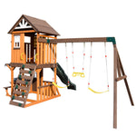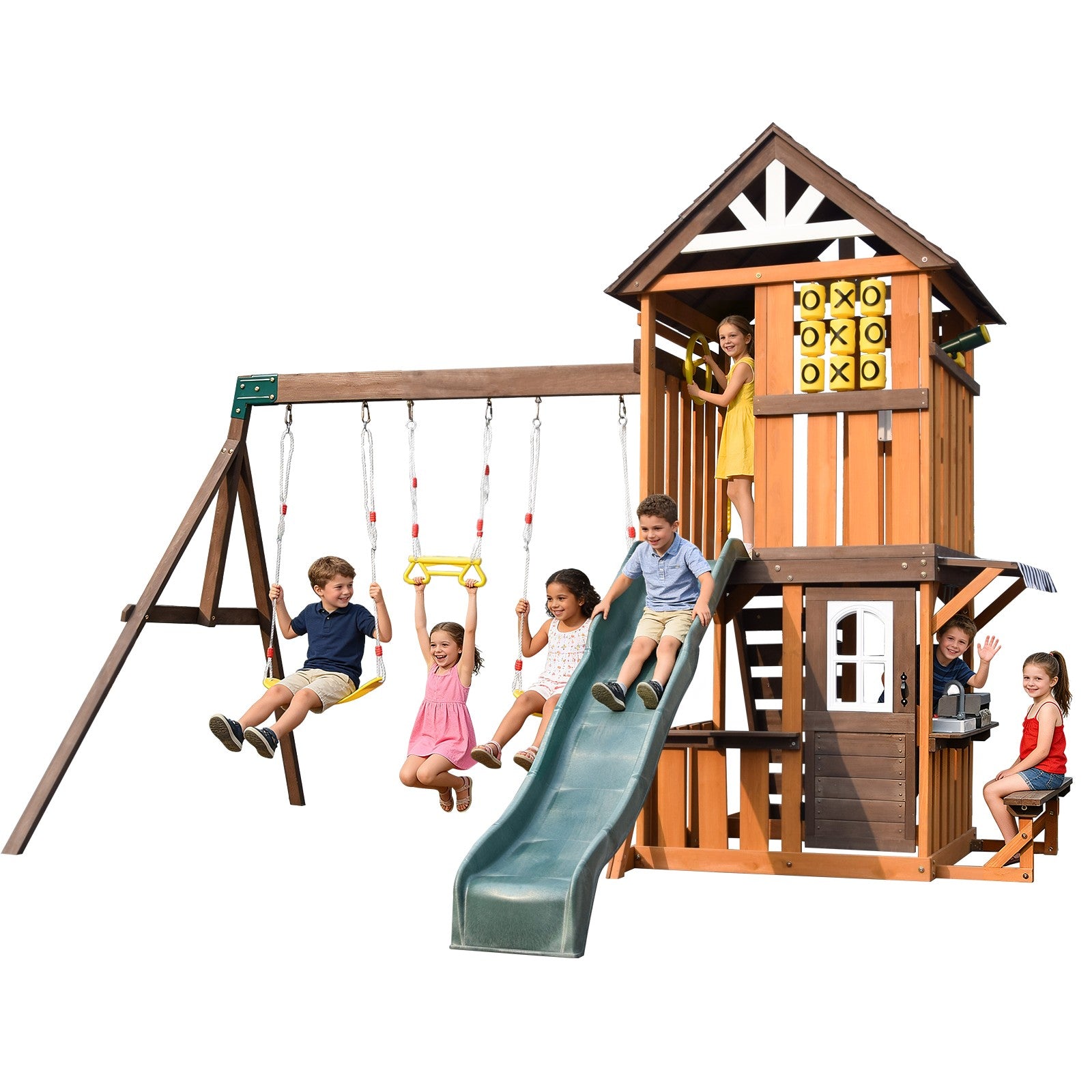 Cedar Wood Swing Set with Wave Slide, Play Kitchen, Rock Wall Ladder, Belt Swings, Toy Telescope, Steering Wheel, Tic-Tac-Toe, Balconies, Outdoor Playhouse Playground Set for Backyard Garden