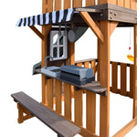 - The playhouse area includes a toy grill and sink, simulating a real kitchen setup. It lets kids unleash their creativity as they role-play as "little chefs" cooking up pretend meals. The bench with a sunshade doubles as a "dining and resting spot" and a playtime hangout—making the role-play experience feel even more complete