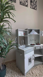 The Corner wooden kitchen set for kids comes with a water dispenser, microwave, oven, sink, play phone, real towel rack and hooks(hanging vegetable board), and storage shelf, all of the design can improve children's hands-on skills. Provides hours of educational entertainment fun.