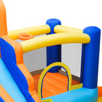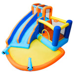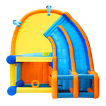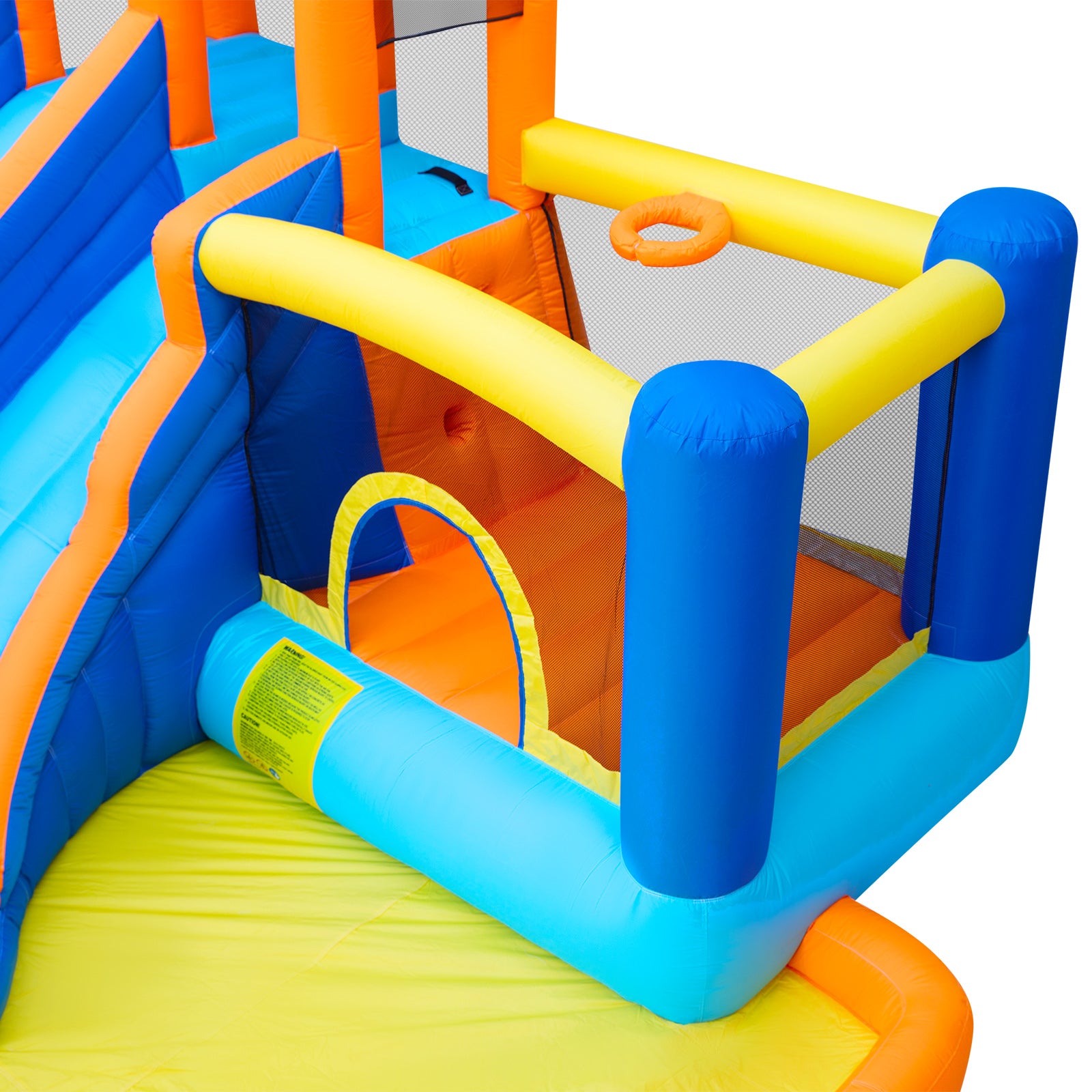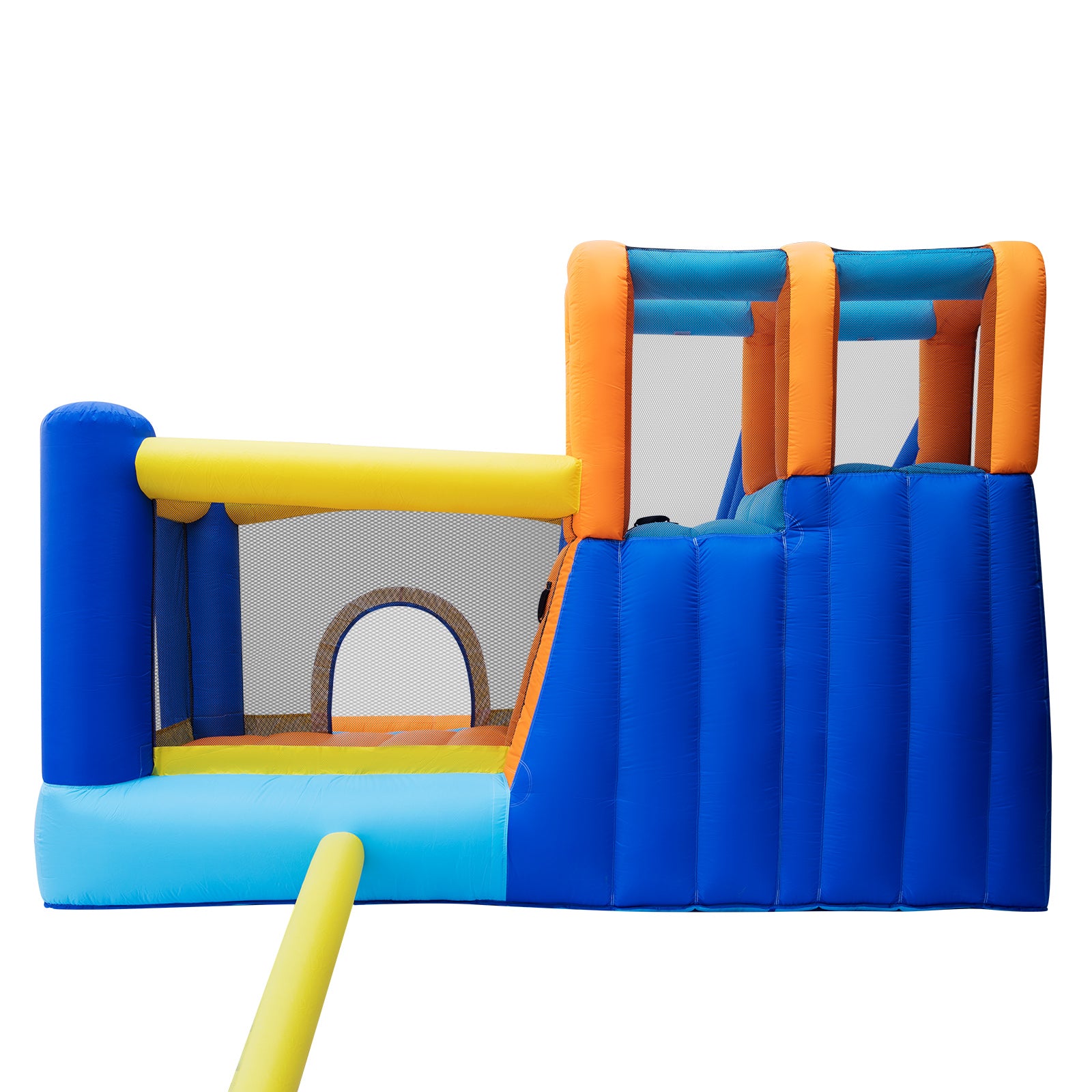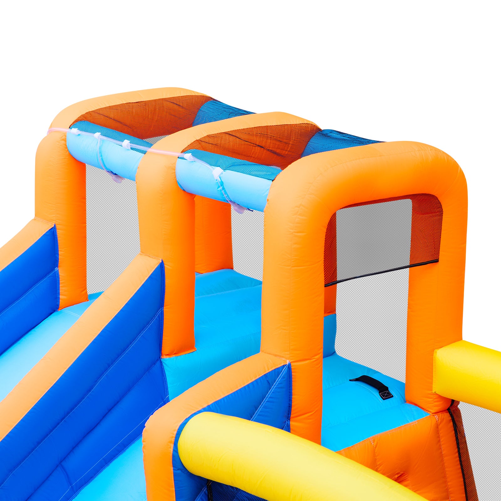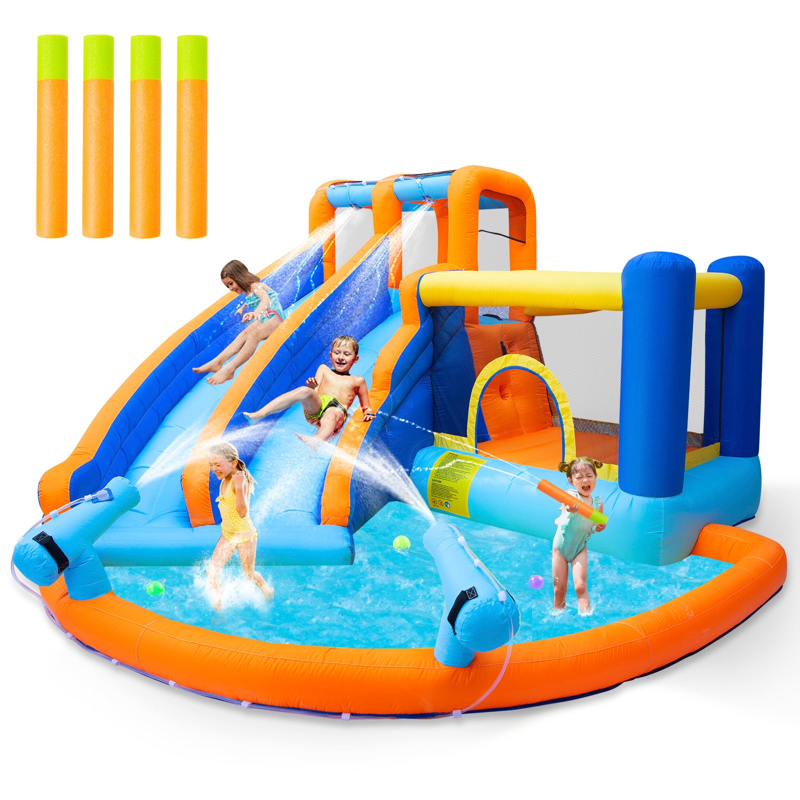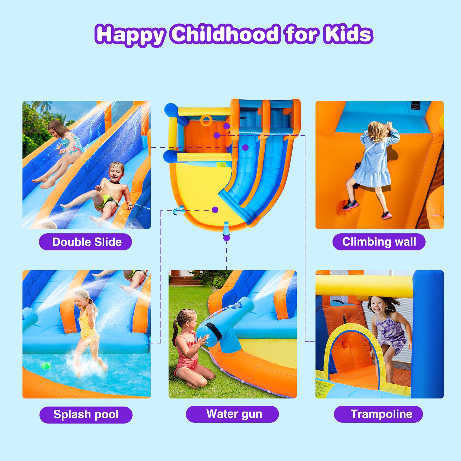 - 【Stimulate Kids' Potential】This bounce house features double water slides(with heightened slide handrail, sliding down and the top will come out of steady spray of water to keep the slides wet; Exciting climbing wall; Trampoline(protective netting,tall mesh walls surround can keep your kids safe while jumping and allow ventilation); Splash pool(spraying friends with water gun or enjoy the shower). Let kids share endless happiness with their friends as they race, climb, run, jump, and slide.