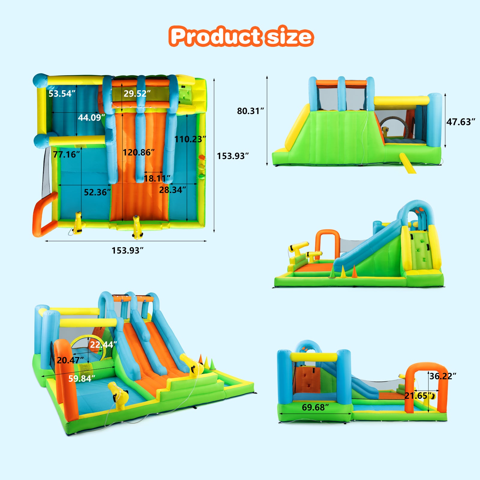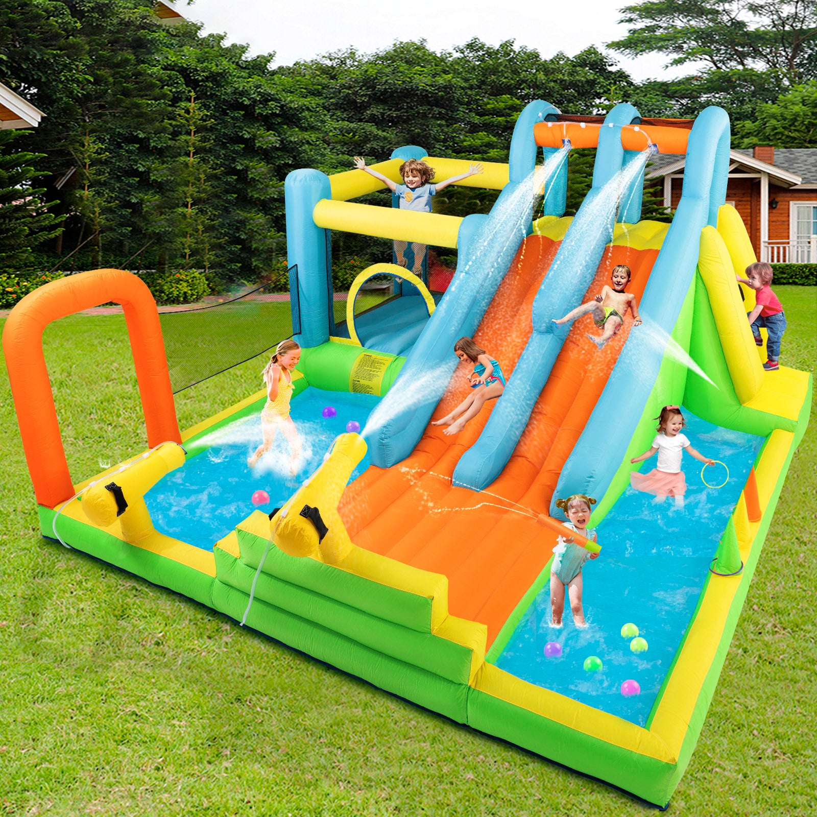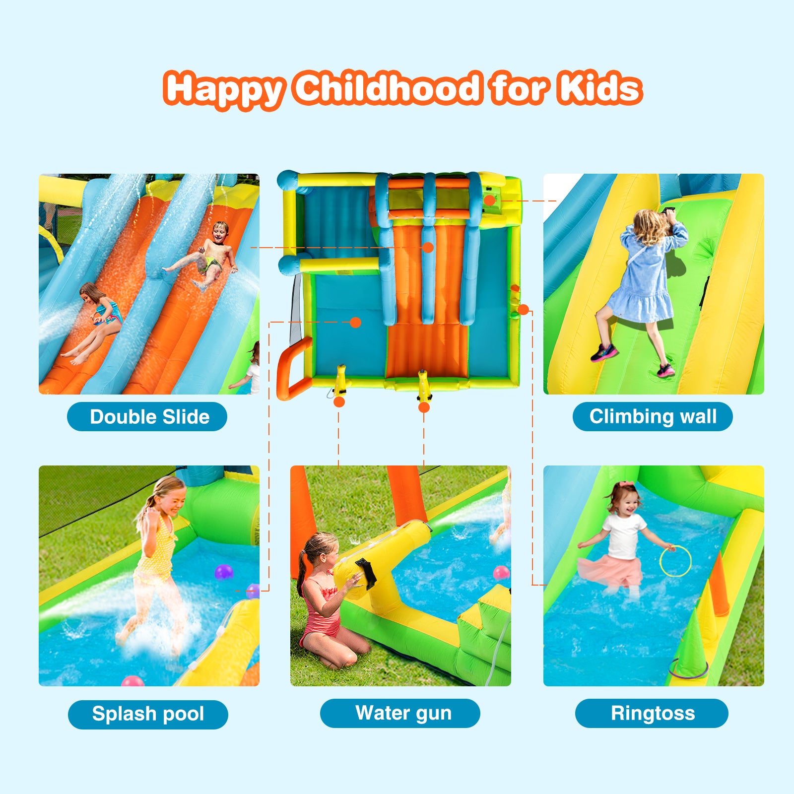- 【Stimulate Kids' Potential】The bounce house features double slides that allows two participants to race side by side to add an extra element of friendly competition (with heightened slide handrail, sliding down and the top will come out of steady spray of water to keep the slides wet); Exciting climbing wall; Trampoline(protective netting,tall mesh walls surround can keep your kids safe while jumping and allow ventilation); Splash pool(spraying friends with water gun or enjoy the shower). Let kids share endless happiness with their friends as they race, climb, run, jump, and slide.