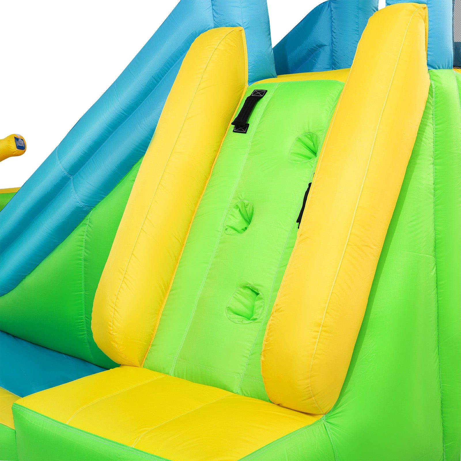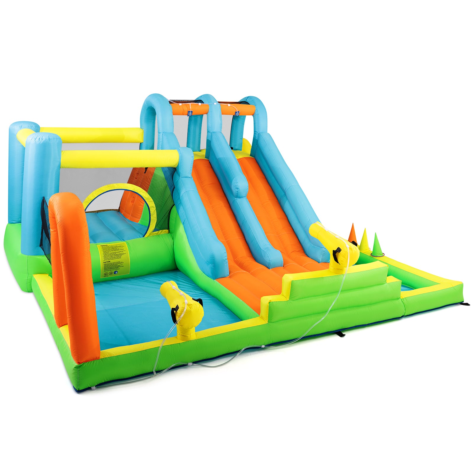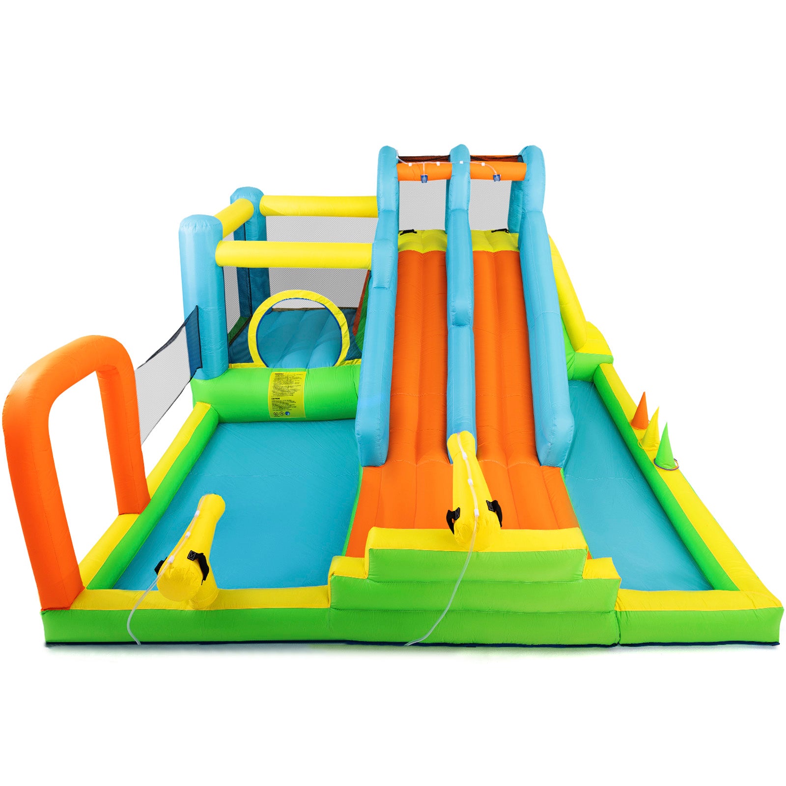 - 【Stimulate Kids' Potential】The bounce house features double slides that allows two participants to race side by side to add an extra element of friendly competition (with heightened slide handrail, sliding down and the top will come out of steady spray of water to keep the slides wet); Exciting climbing wall; Trampoline(protective netting,tall mesh walls surround can keep your kids safe while jumping and allow ventilation); Splash pool(spraying friends with water gun or enjoy the shower). Let kids share endless happiness with their friends as they race, climb, run, jump, and slide.
