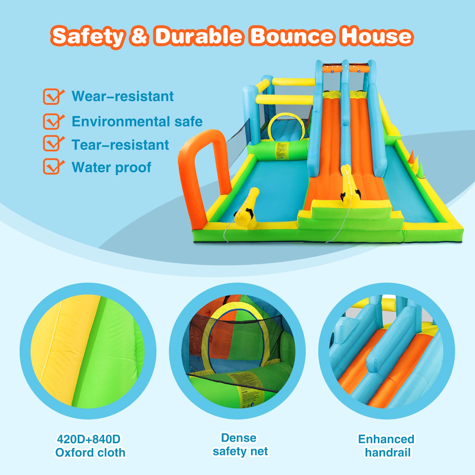 - 【Excellent Durable & Extra Thick Material】JOYLDIAS inflatable water double slide bounce house is made of heavy duty puncture proof and wear resistant 420D+840D extra thick oxford cloth, combined with double reinforce sewing techniques to enhance its ultimate durability, this inflatable water slide is designed to withstand the rigors of enthusiastic play,keeping kids safe and parents more at ease.