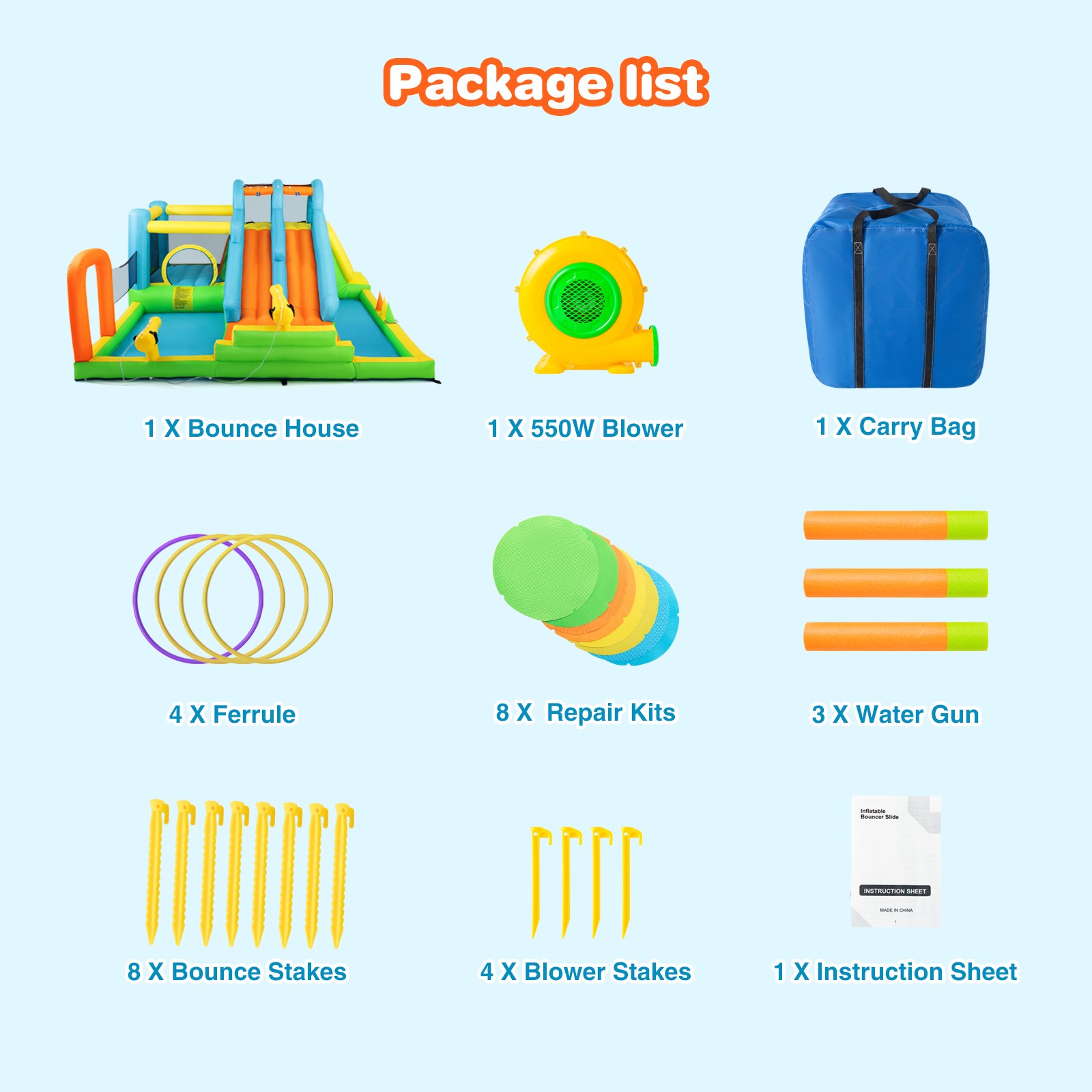 - 【Rich Product Set】Including 1x bounce house, 1x air blower, 8x bouncer stakes,, 1x carry bag, some repair patches, 3x water spraying gun(free), 4x Ring Toss,1x instruction. Perfect for kid's birthdays, family gatherings, or any outdoor celebration.