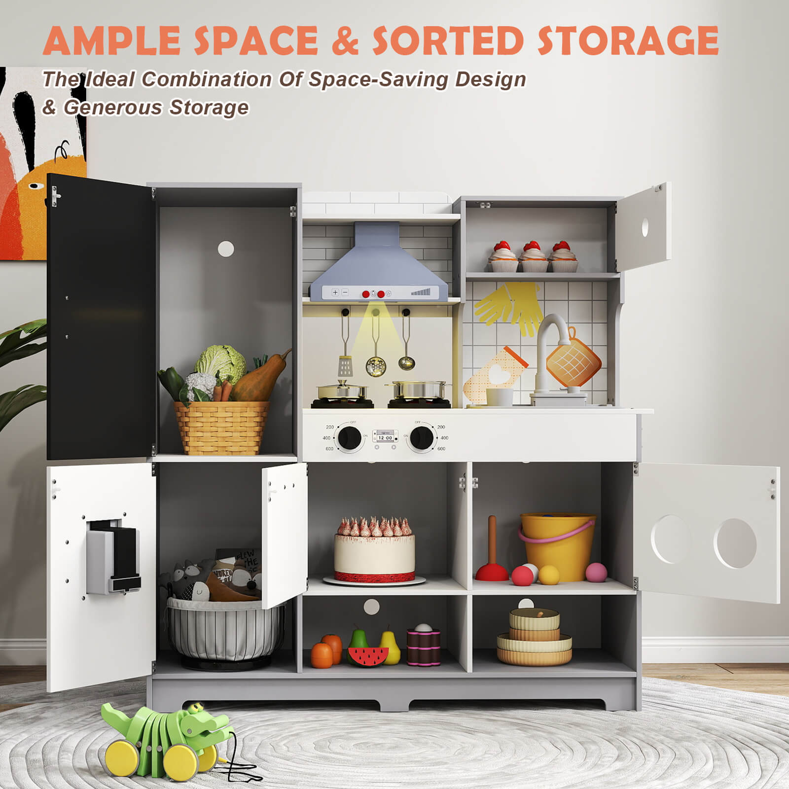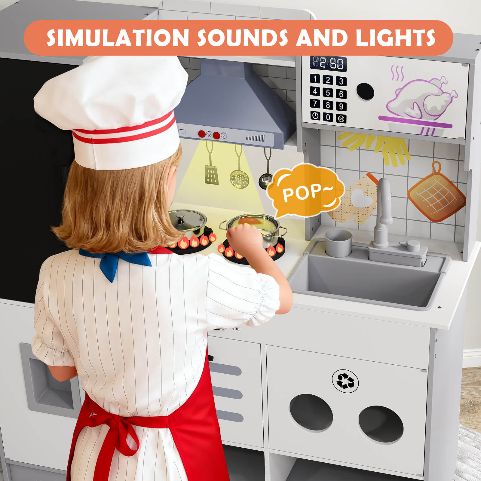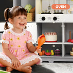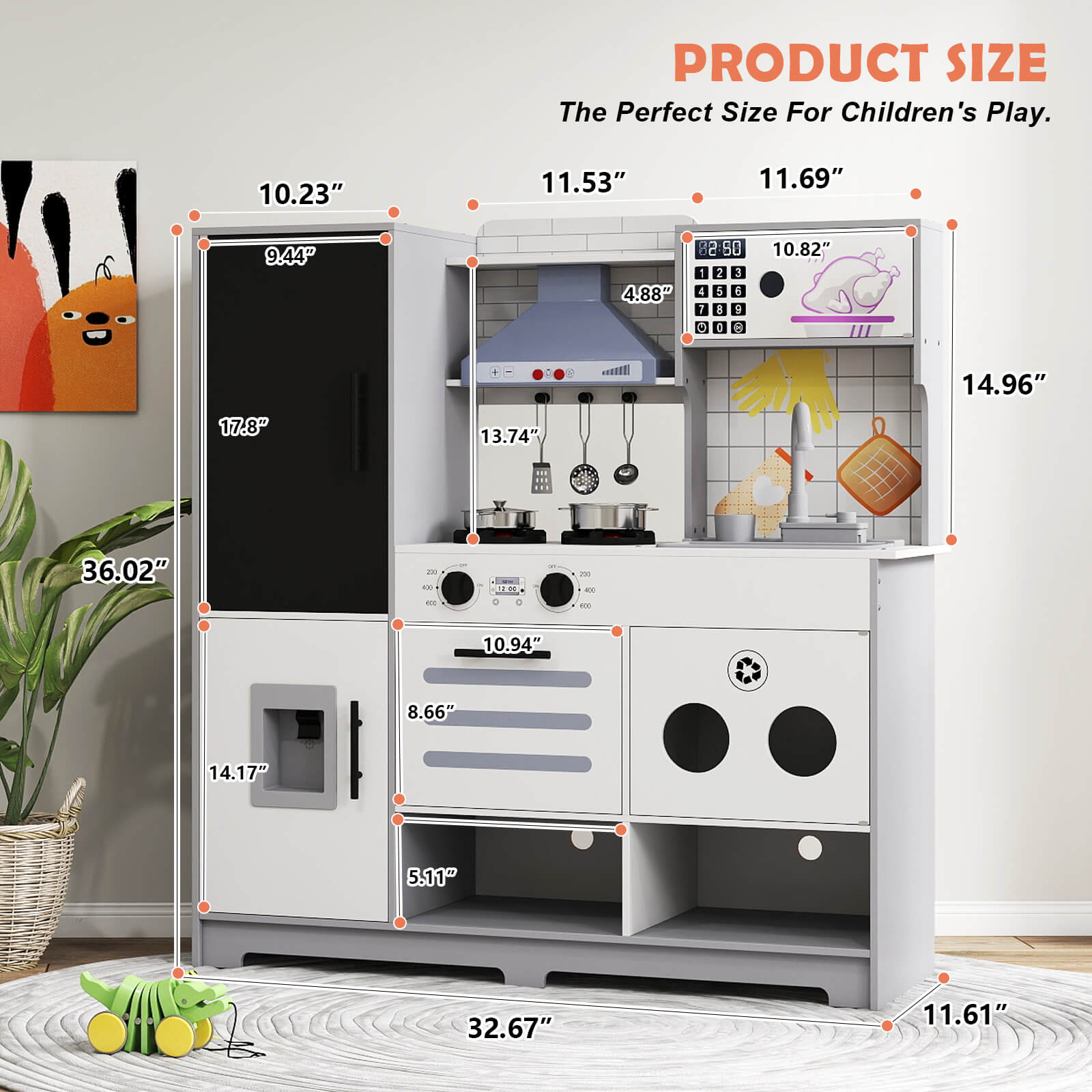 - High Quality & Safety - Kids play kitchen is made of durable high-quality wood structure MDF+PP, have highest safety, and easy to wipe clean for every day messes. The overall size is 32.67*11.61*36.02'' , modern design, color and appearance, blends in perfectly with your home
