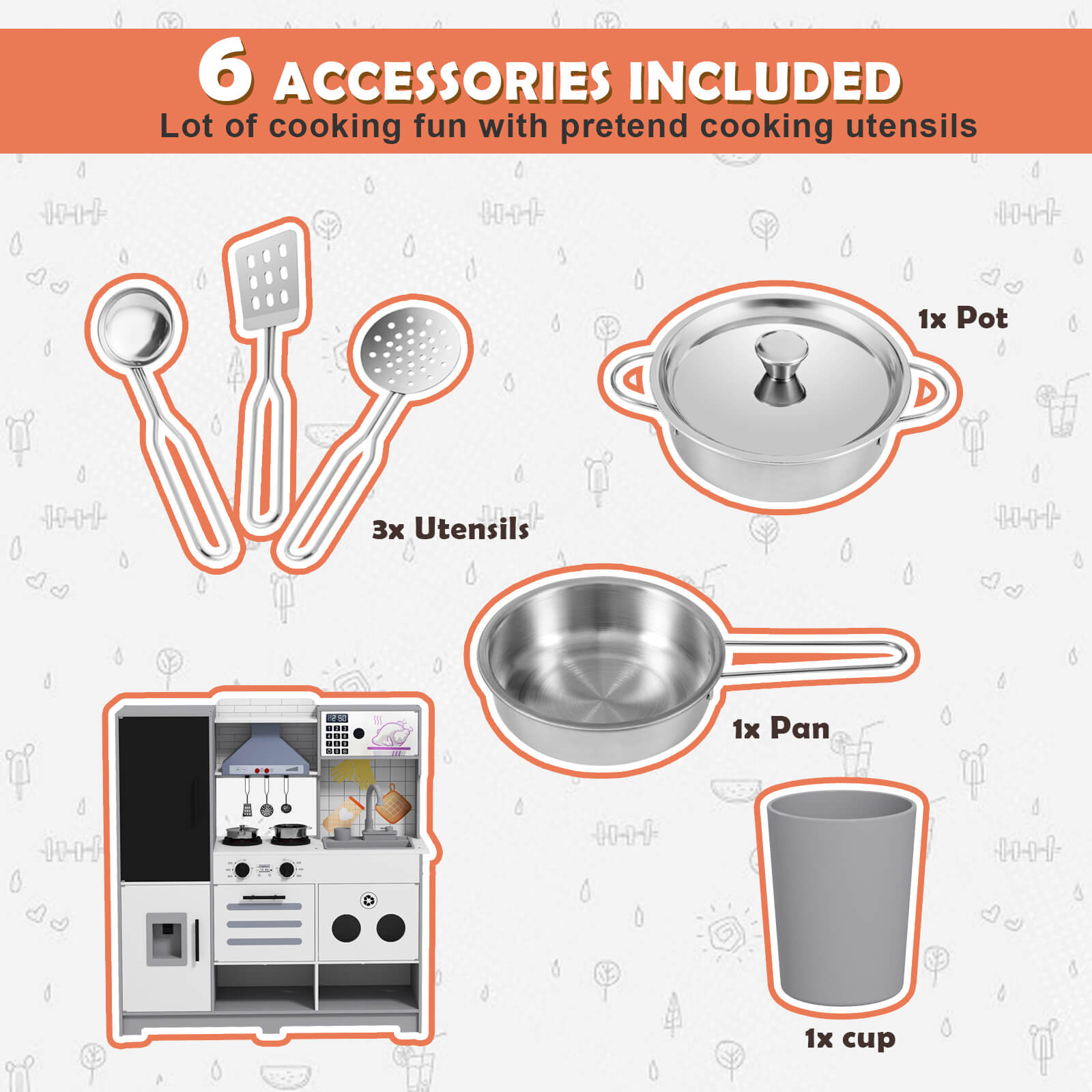 - Real life kitchen - Our interactive designs are more than toys, immerse boys and girls in real kitchen facilities for meaningful learning, when your child pretends to bake and cook in the kitchen (metal spatula, ladle, pot with lid, and skillet)