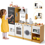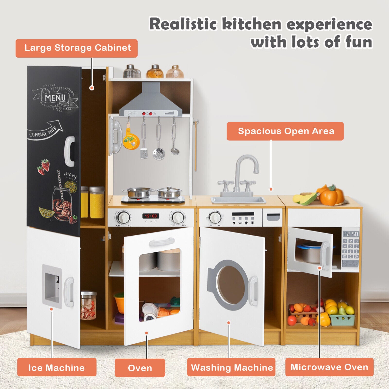 Our interactive kitchen design focuses on simulated experiences. The stove and range hood have real lights and sound. And the emulational oven, stove, microwave, washer, faucet , Refrigerator, ChalkboardBEST GIFT: When your child uses this safe and fun kitchen toy, they can invi, Removable sink and kitchenware (pots, spatulas) complete function, can enhance children's sense of engagement and fun, as if they were in an adult's kitchen.