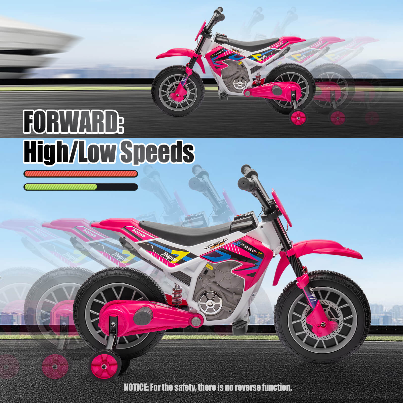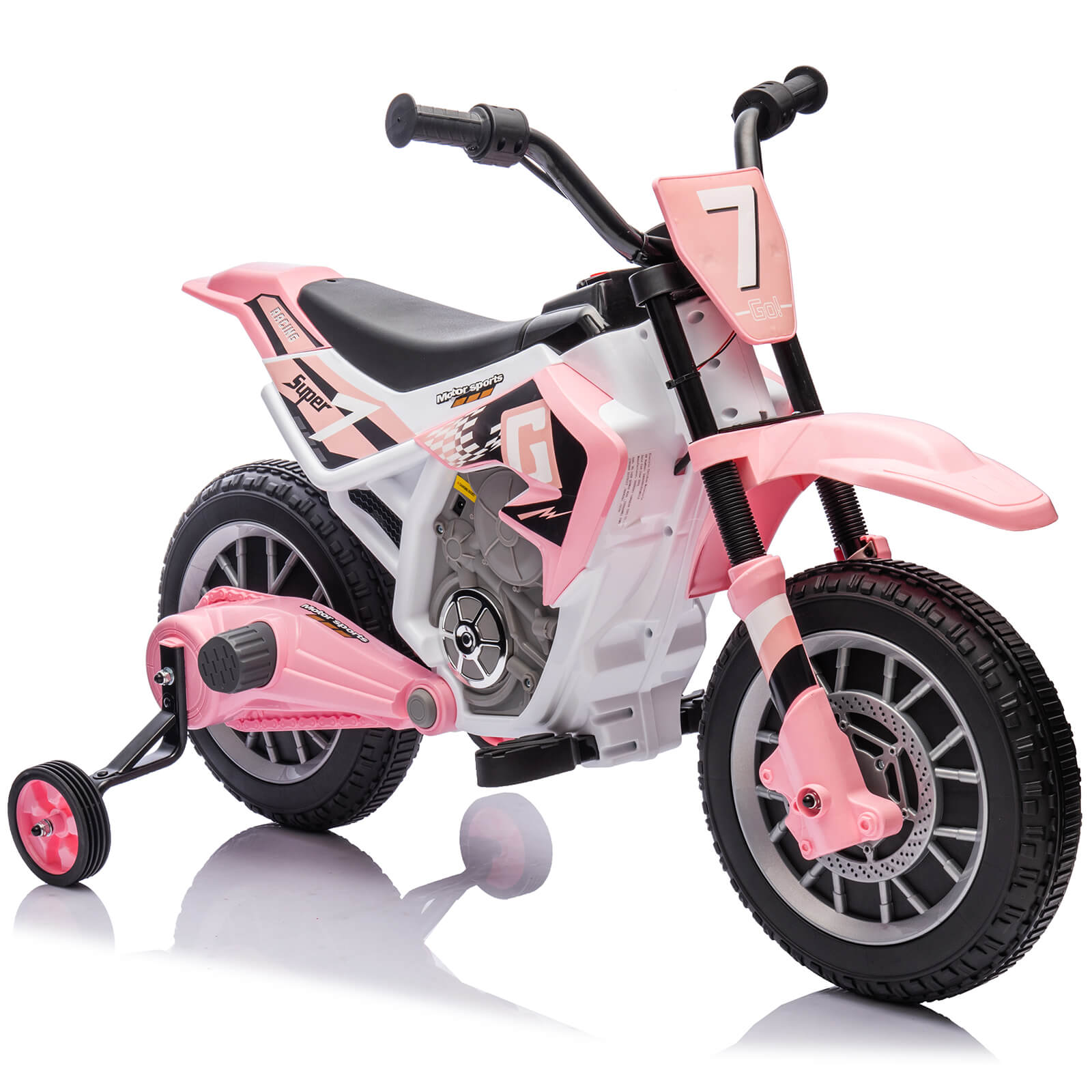 Training Wheels for Higher Safety - There are 2 training wheels which keep the motorcycle as steady as possible while preventing it from falling over to enable higher safety. Applicable to various roads, including brick road, asphalt road, and cement road.