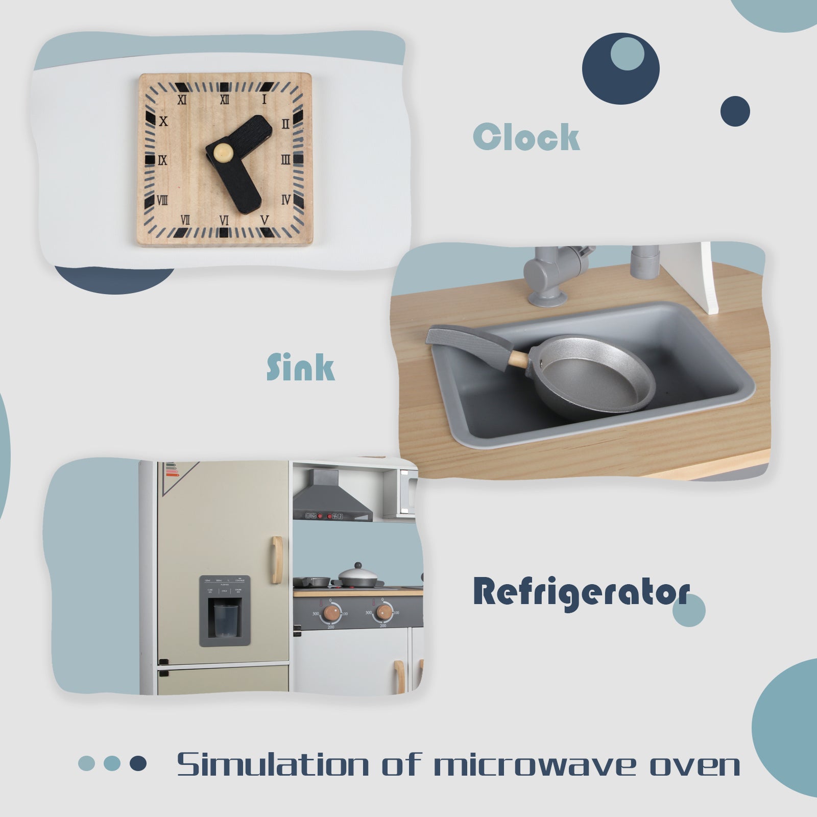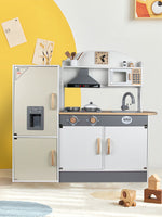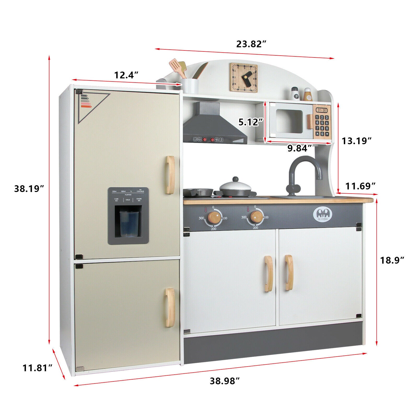 HIGH QUALITY & SAFETY: Kids play kitchen is made of durable high-quality environmentally friendly wood structure MDF+PP, have highest safety, the overall size is 33.98*11.81*38.19'', modern design, color and appearance, blends in perfectly with your home, is the best gift for children aged 3+ up.