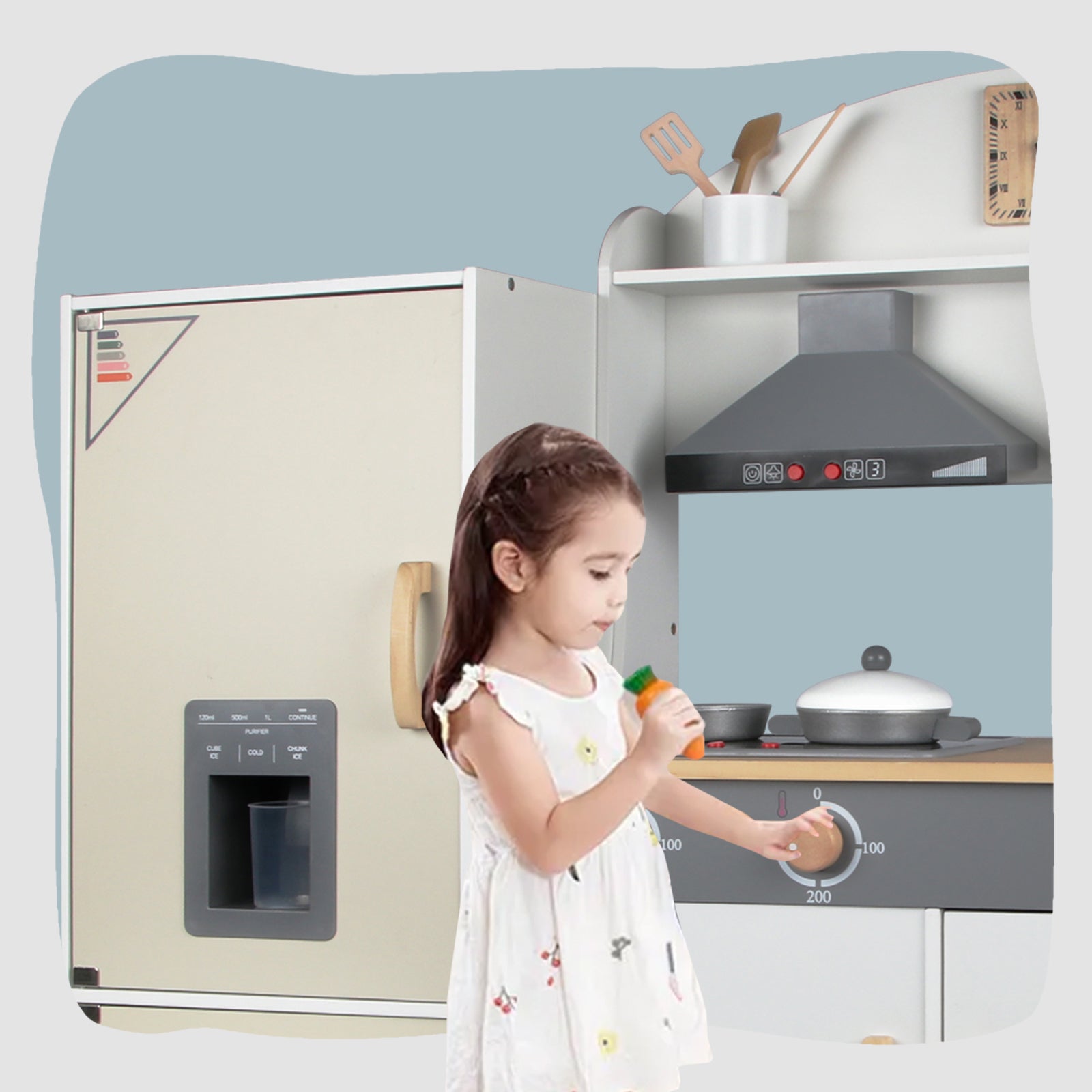 Kid Play Kitchen Pretend Wooden Toddler Ice Cube Dispenser Refrigerator Toy Set